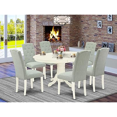 Standard furniture gateway white 7 piece dining room set w/parsons. New classic latitudes 7 piece counter height round corner dining set in two tone. The 100% linen upholstery is filled with foam for an inviting look and feel. Dark brown (28) gray (24) white (23) light brown (14) black (10) blue (3) silver (2) green (1) material. 72 round dining table and 10 stacking arm chairs.